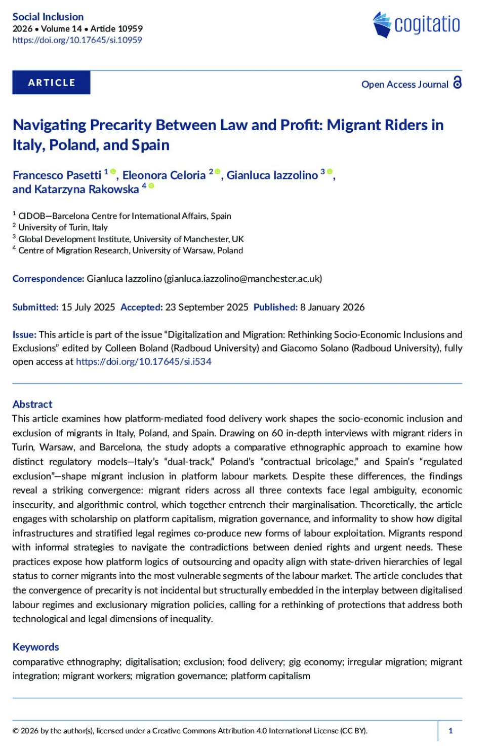 How to cite : Pasetti, F., Celoria, E., Iazzolino, G., & Rakowska, K. (2026). Navigating Precarity Between Law and Profit: Migrant Riders in Italy, Poland, and Spain. Social Inclusion, 14, Article 10959. https://doi.org/10.17645/si.10959
